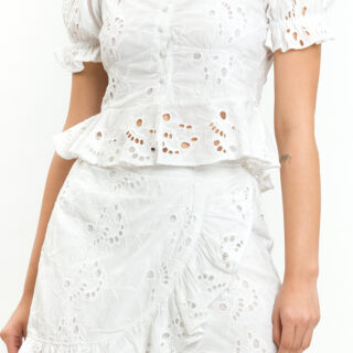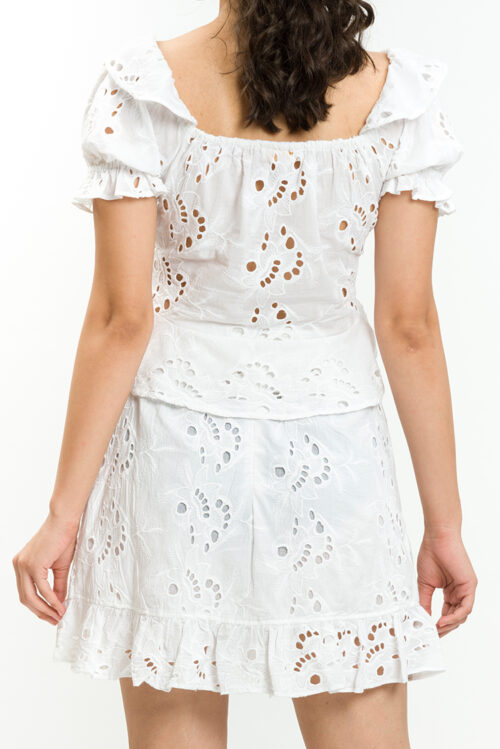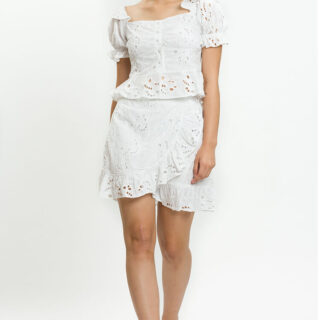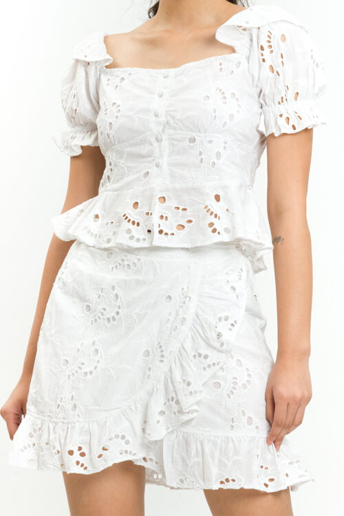We love this Floral Broderie skirt, with a wrap over design, and beautiful white broderie, pair this with the matching broderie top for the perfect co-ord.