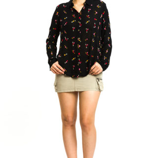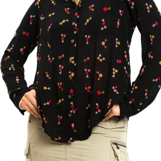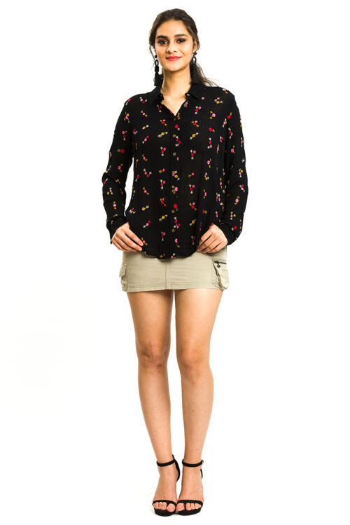 We can’t get enough of this lightweight black cheesecloth shirt with multi-colour floral embroidery all over. Featuring long sleeves, pair this with a skirt, or denims for the perfect look.