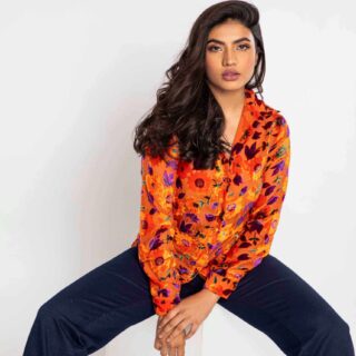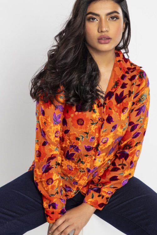 This velvet shirt is a seasonal must have. Featuring an orange velvet fabric with floral print, what’s not to love? Team with dark pants to complete the vibe.