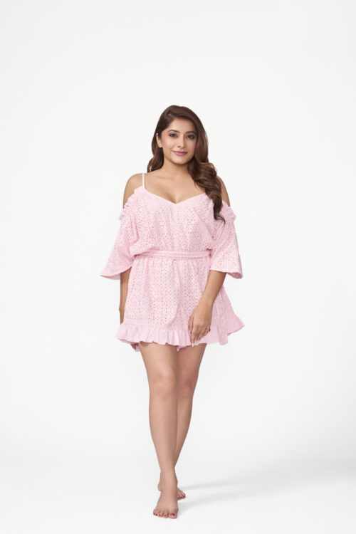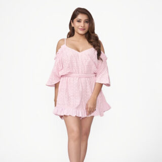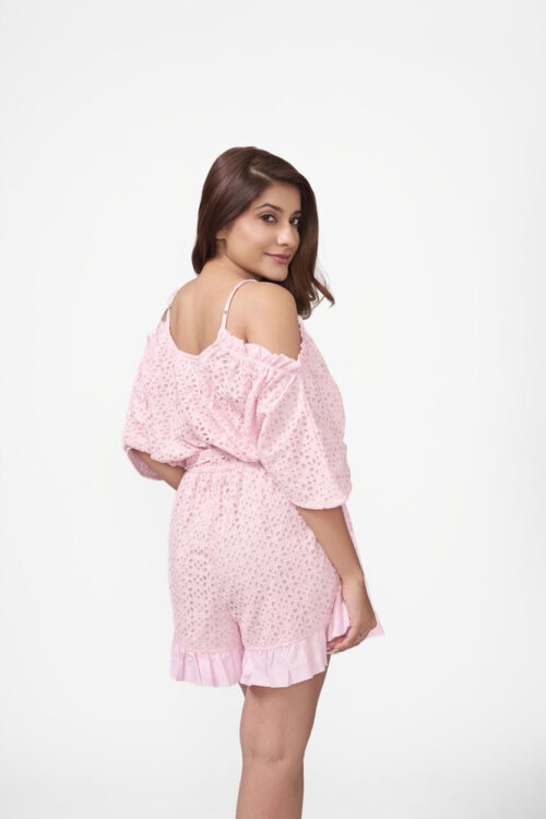 Make way for the new stunner in your wardrobe. Featuring a soft cotton broderie fabric, in a light pink shade, this playsuit is exactly what you need for that day out. Pair with sneakers or stilettos for that perfect vibe.