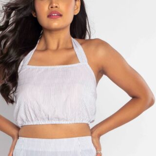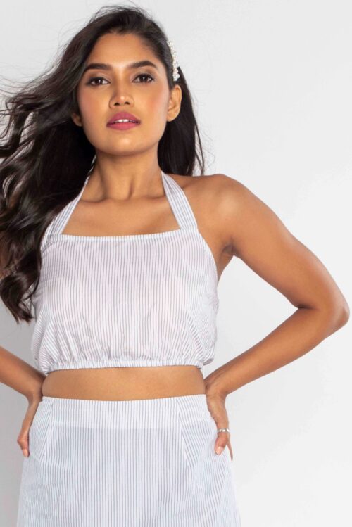 Give your off duty look an edge with this crop top. Featuring a pinstripe fabric, tie back detail and crop shape this top is sure to make heads turn. Team with the matching stripe skirt to complete the vibe.