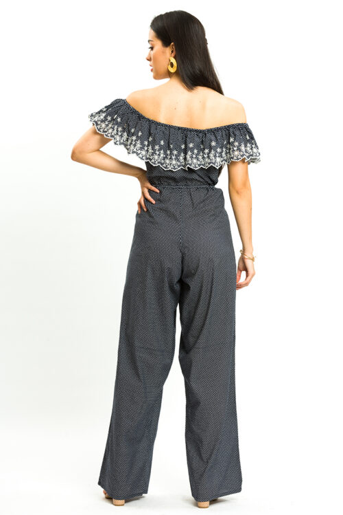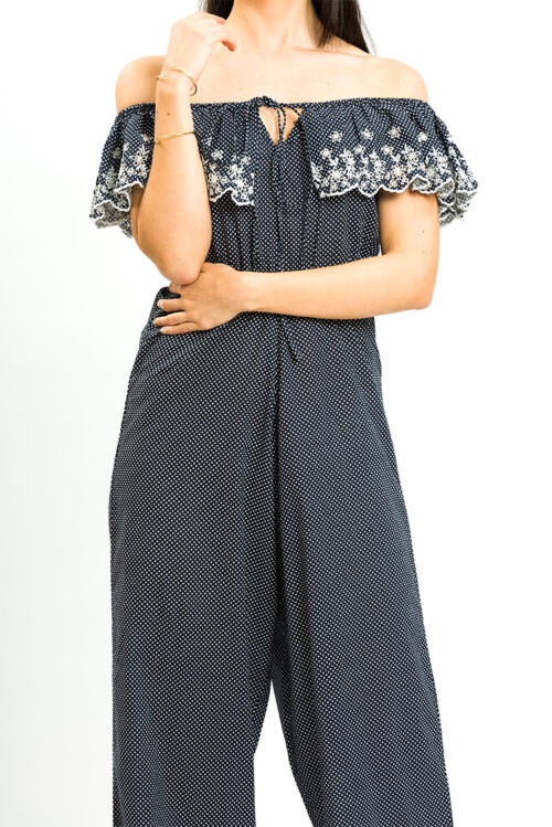 This polka dot embroidered jumpsuit is the perfect occasion wear, featuring a navy fabric with polka dot print, an off shoulder design with broderie frill detail.