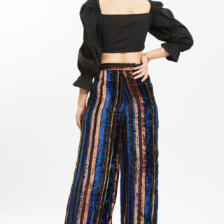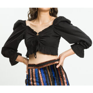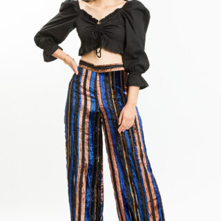 We have the perfect cotton top, with a Bardot neckline and frill details. Pair with fashionable velvet pants for the perfect look.