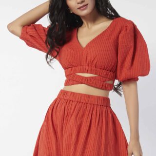 Give your wardrobe the edge with this seersucker top. Featuring a stripe fabric and strap front design, pair with the matching skirt for that perfect vibe.