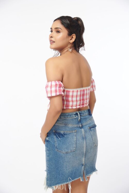 This top is giving us the vibes this season. Featuring a soft, textured check fabric and a bardot fit, team with denims for that perfect combination.