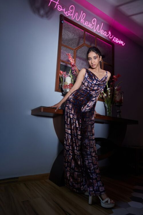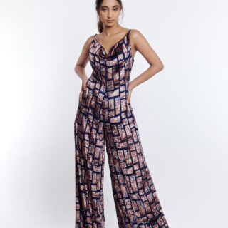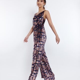 This jumpsuit is sure to be a head turner, with its gorgeous velvet print. Featuring a Cowl Neck shape, pair with stilettos and be party ready.